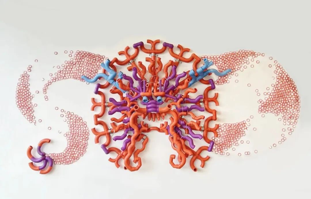 央美藝術(shù)家們?nèi)谌胨麄儗?duì)龍勝管和生活的獨(dú)特理解想象,通過(guò)熱熔、剪切、拼接等手法,將龍勝PPR水管變幻成了美麗絕倫的藝術(shù)品。一根根水管連接在一起,完全改變了水管的刻板印象,形成了各色各樣獨(dú)特的造型。不僅層次感分明,而且還擁有了線條的張力,形態(tài)的韻律,仿佛在傳訴著專屬龍勝管的藝術(shù)故事。