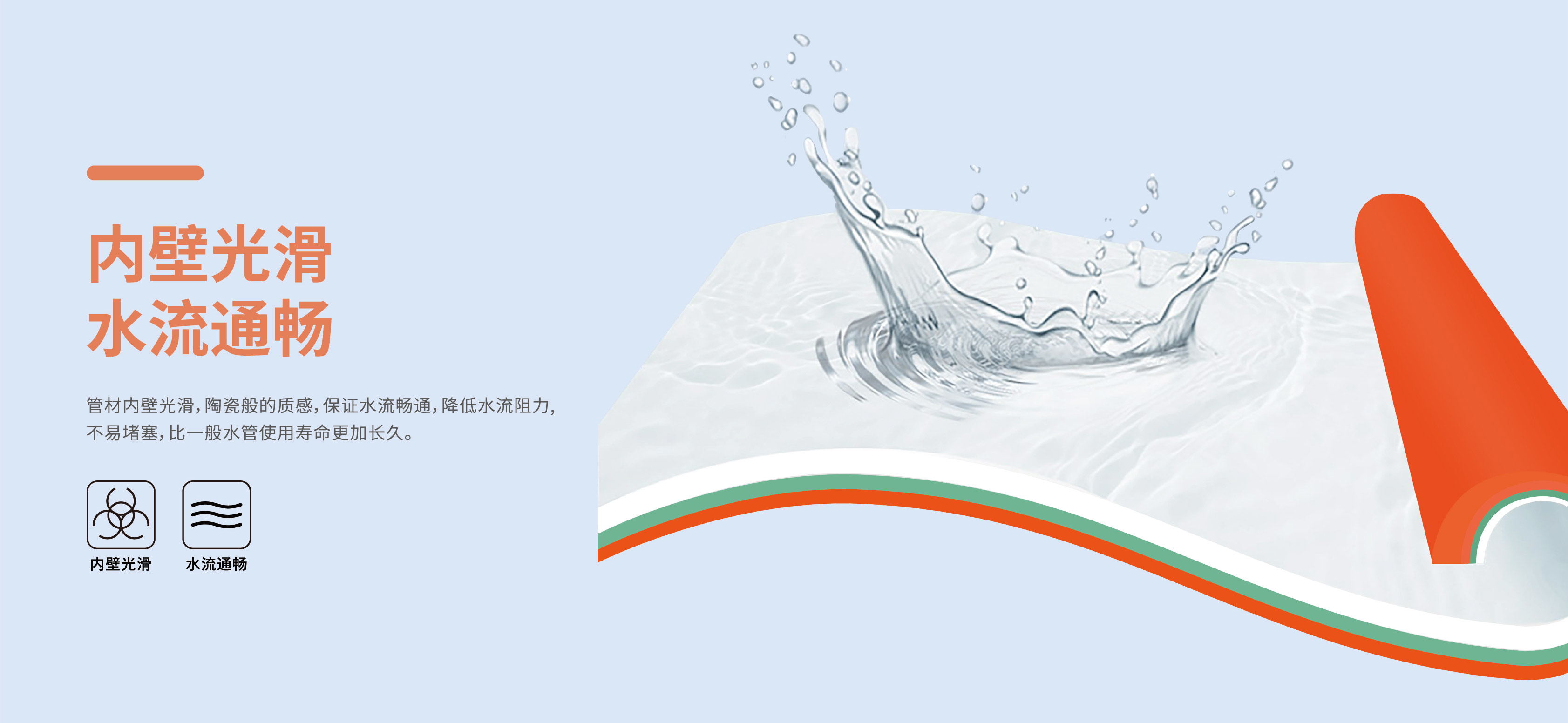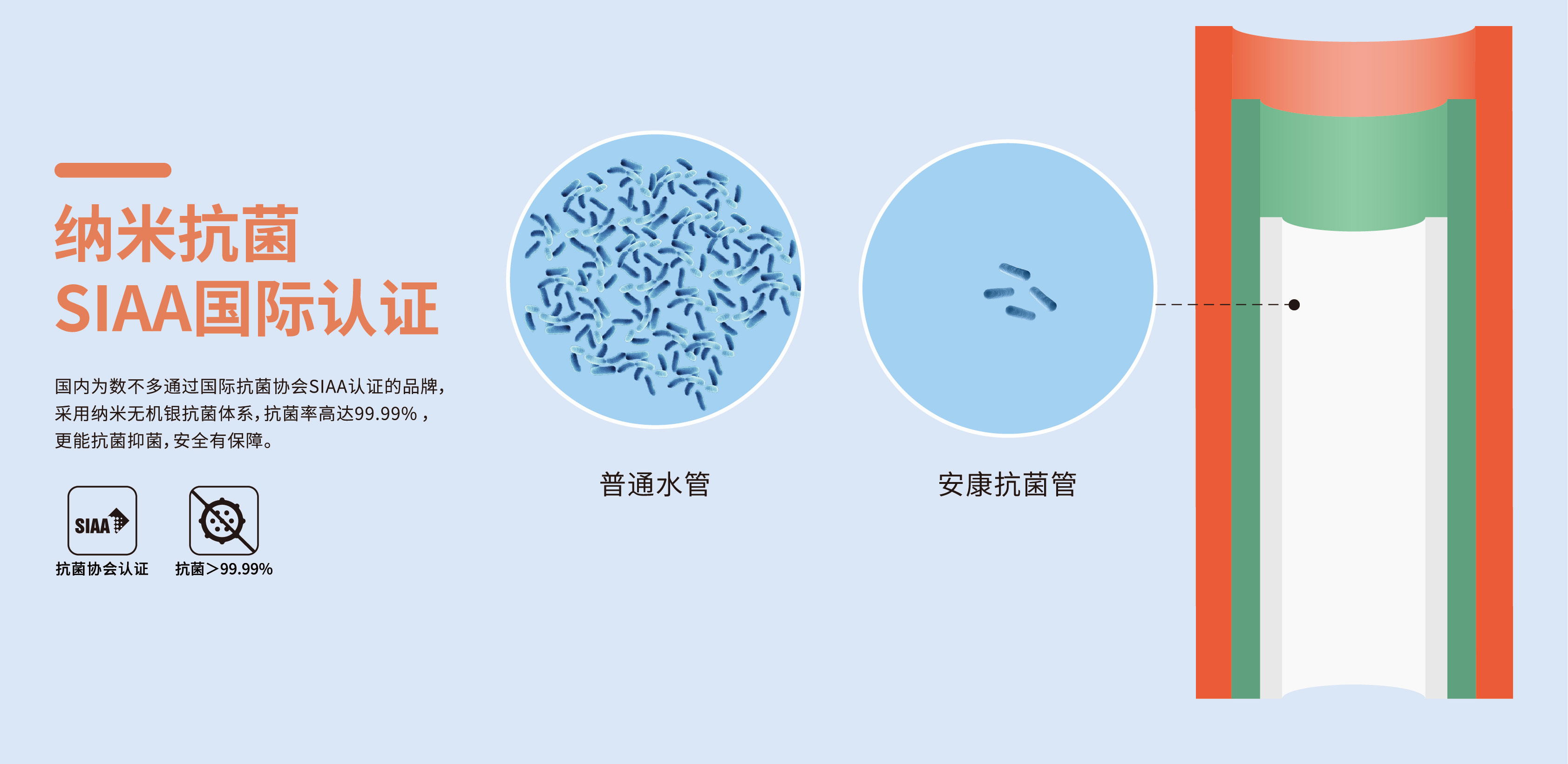 第三層采用無機銀抗菌體系,高效抑菌經國家權威機構檢測,能有效抑制大腸桿菌、金黃色葡萄球菌的滋生,抑菌效率達到99.99%,有效保持管道清潔衛(wèi)生