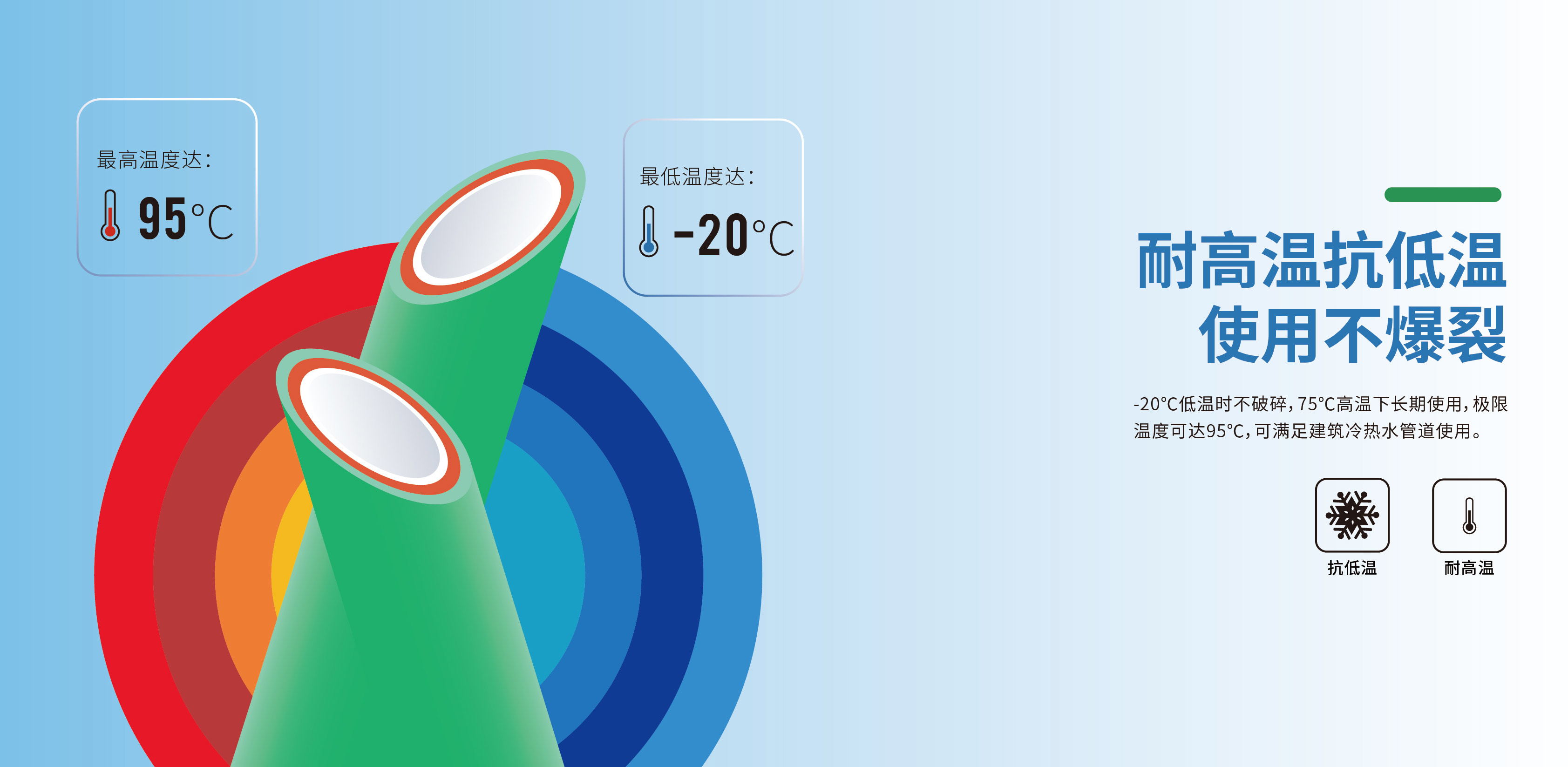 耐高溫性能優(yōu)異,尤其是對低溫抗沖擊性能相對于普通PP-R水管增強(qiáng)80%