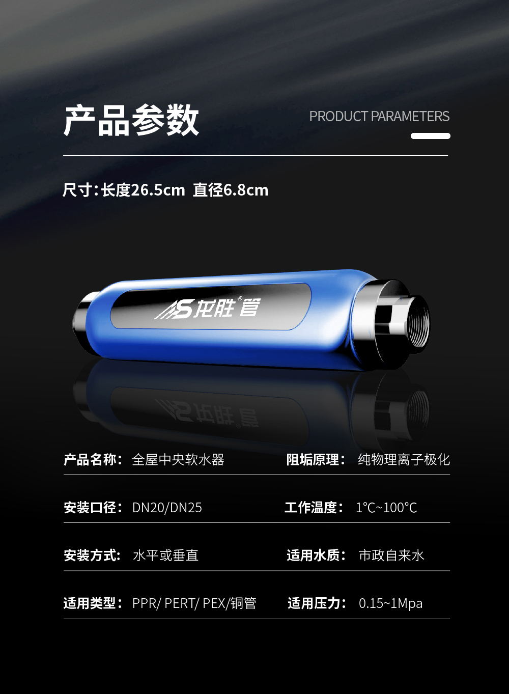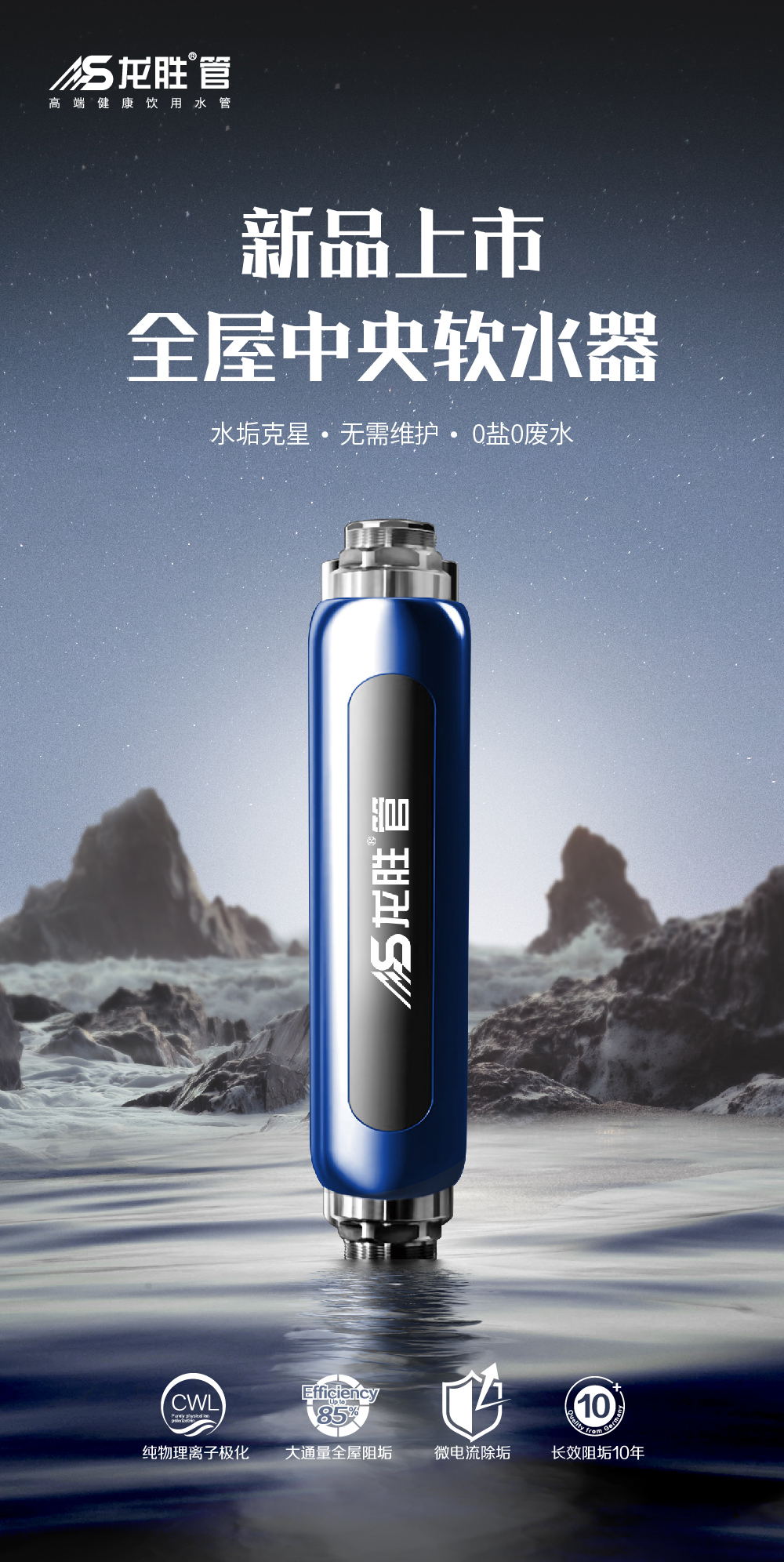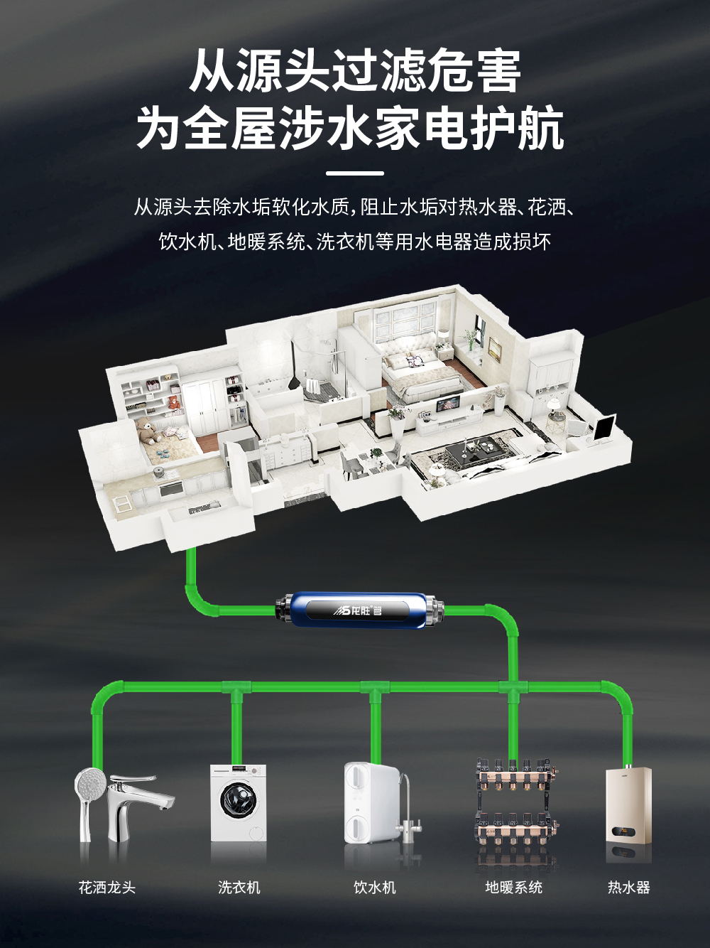 龍勝全屋中央軟水器,水垢克星,無需維護(hù),0鹽0廢水,純物理離子極化,大通量全屋阻垢,全面軟水家用水質(zhì)